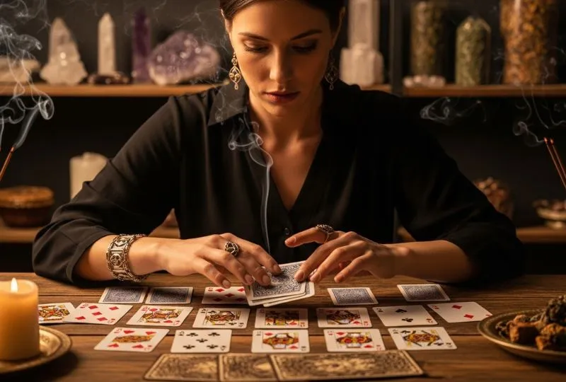 A cartomante pode fechar os olhos por alguns segundos e visualizar uma luz dourada envolvendo o baralho. Isso purifica e alinha a energia instantaneamente.
